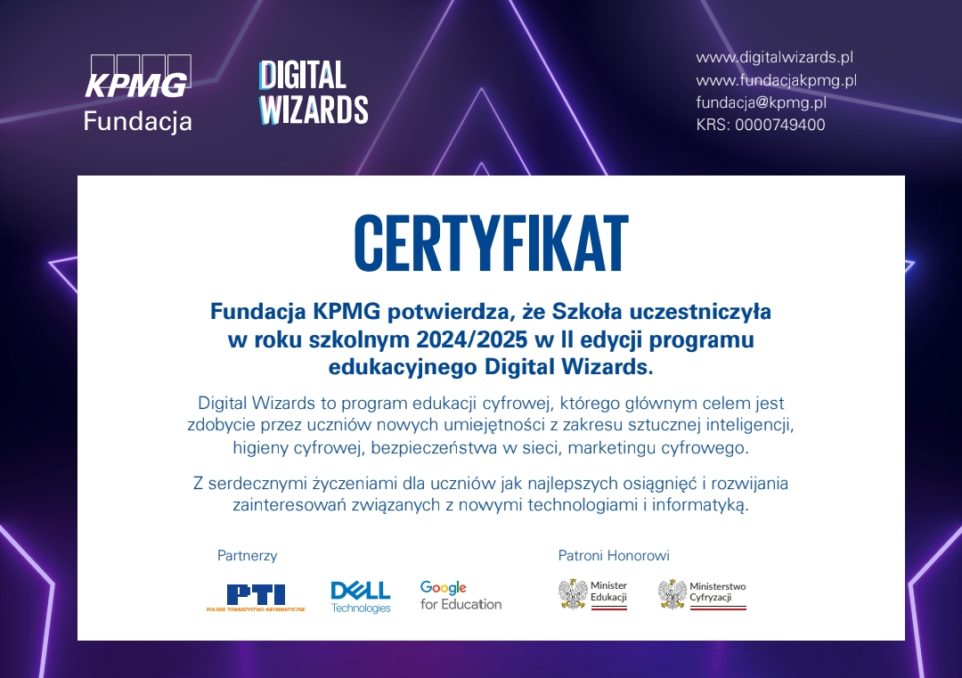 Certyfikat udziału w programie edukacyjnym „Digital Wizards”