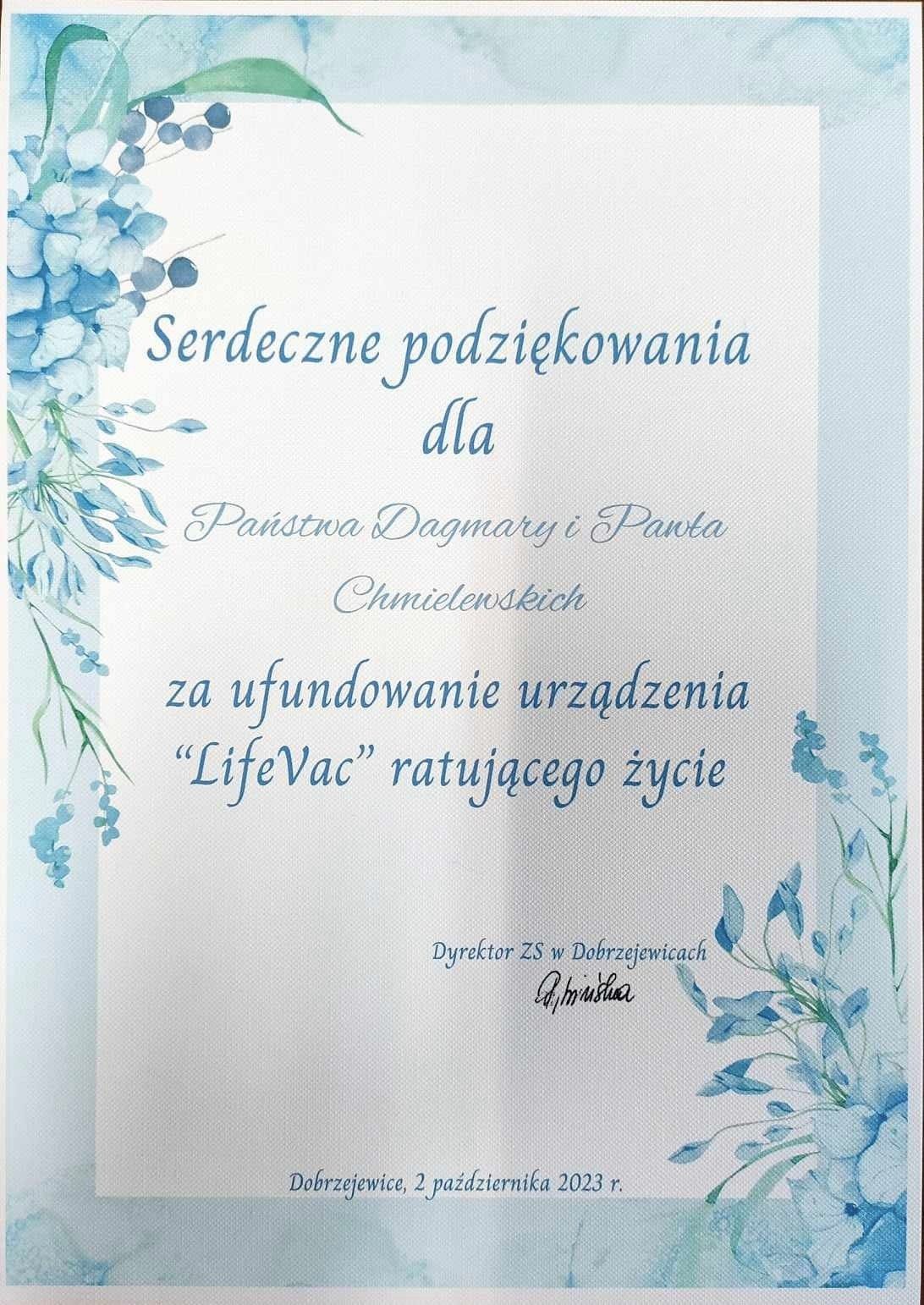 za ufundowanie urządzenia, które udrażnia drogi oddechowe, osoby która się krztusi lub dławi. Jest to urządzenie wykorzystywane jako uzupełnienie standardowej procedury pierwszej pomocy w sytuacji, gdy ta nie przynosi oczekiwanego efektu.