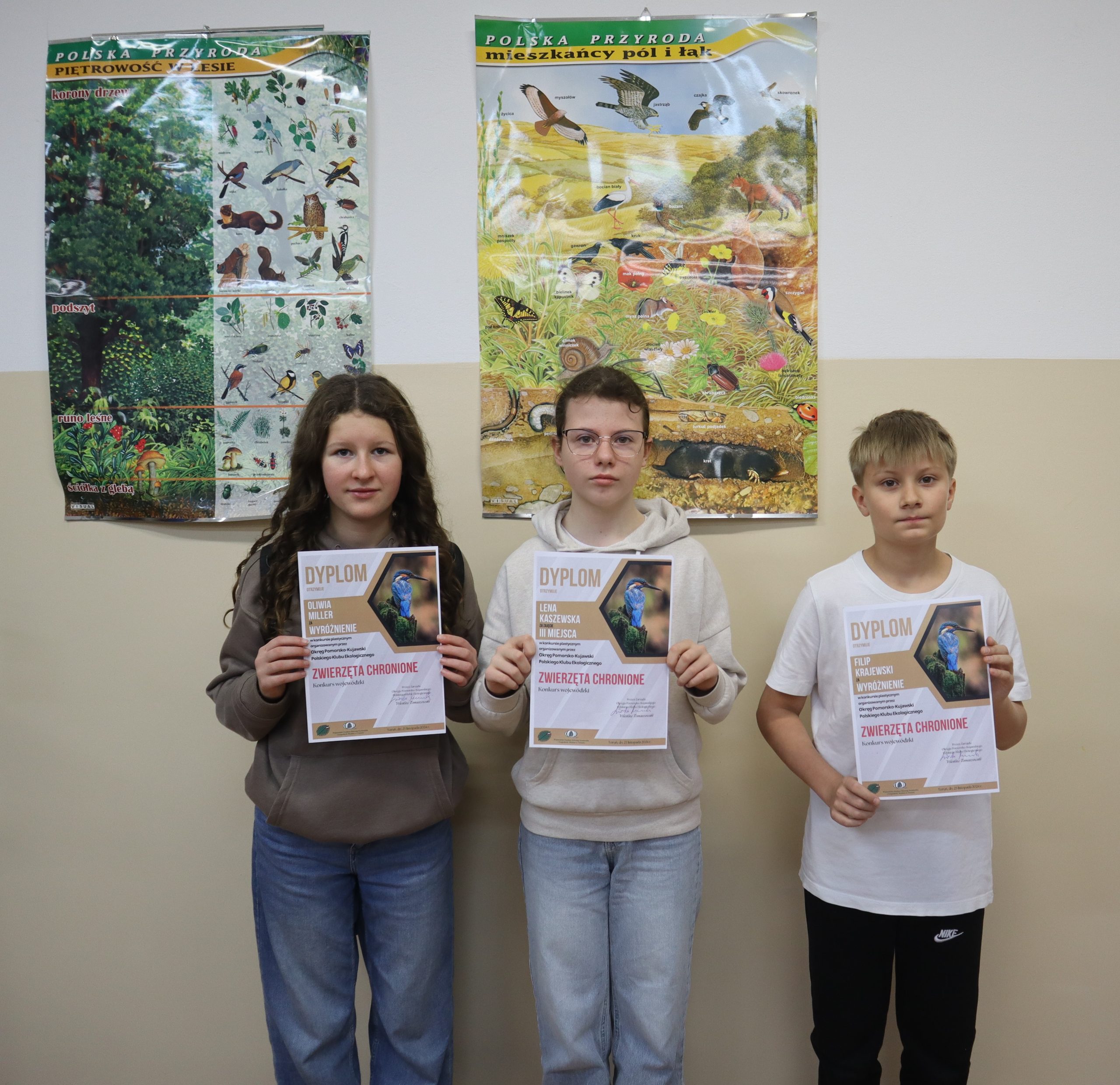23 listopada 2024 roku w Toruniu odbyło się uroczyste podsumowanie konkursów organizowanych przez Polski Klub Ekologiczny. W konkursie plastycznym „Zwierzęta chronione” III miejsce zajęła Lena Kaszewska z klasy 7a a Oliwia Miller (klasa 7b) i Filip Krajewski (klasa 5 c) zostali wyróżnieni.