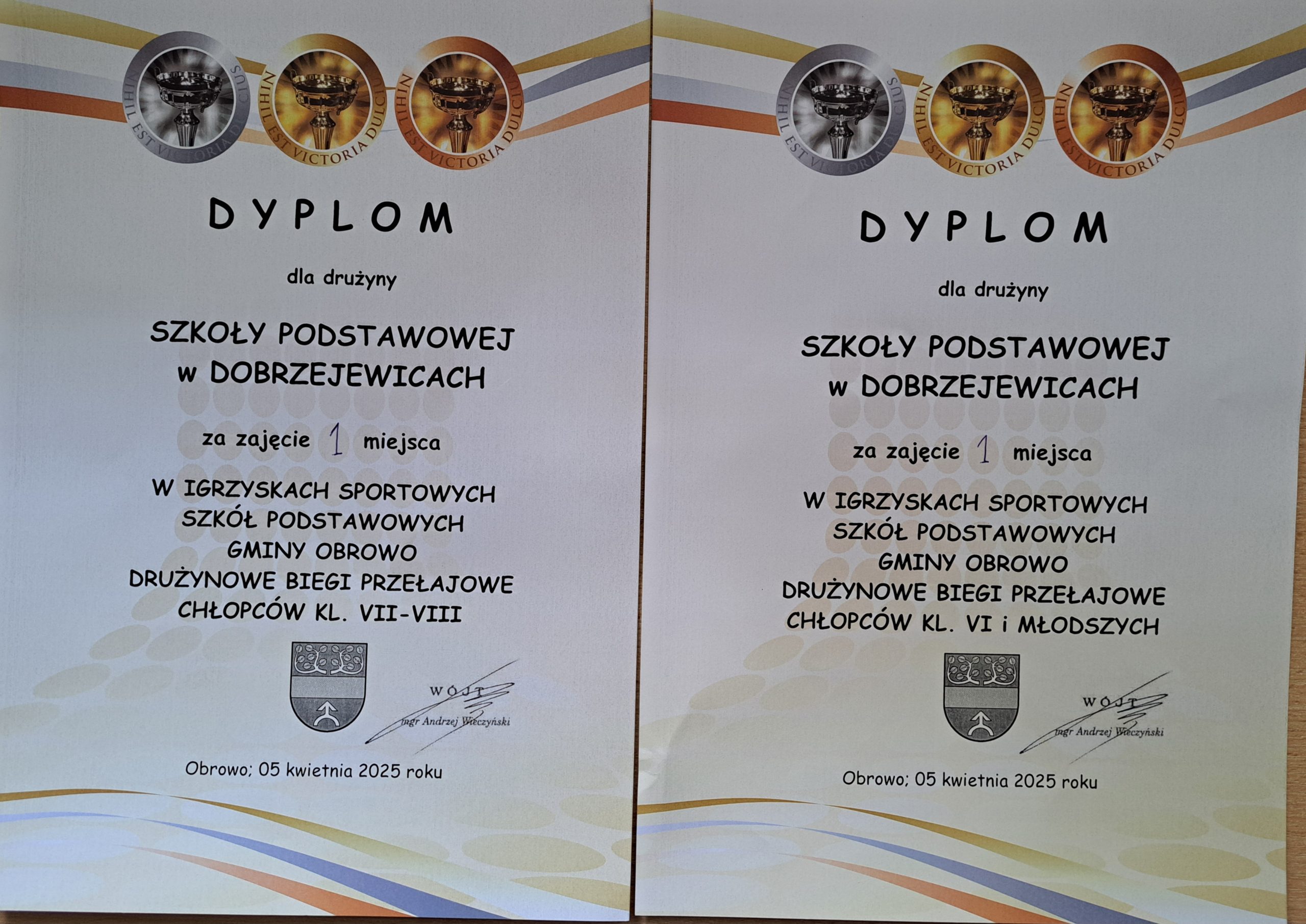 05.04.2025 r. w Obrowie odbyły się drużynowe biegi przełajowe dziewcząt i chłopców. Uczniowie Naszej szkoły zostali MISTRZAMI GMINY trzykrotnie w kategorii dziewcząt klas 4-6, chłopców klas 4-6 oraz chłopców klas 7-8.
