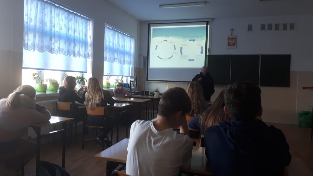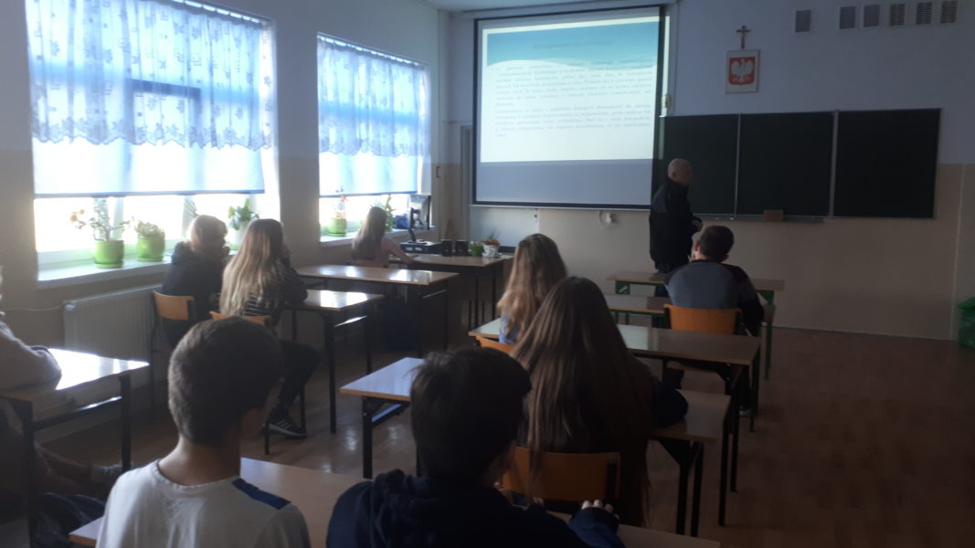 Dnia 19 listopada 2019r. naszą szkołę odwiedził funkcjonariusz Straży Gminnej w Obrowie- pan Marcin Gajewski. W spotkaniu uczestniczyli uczniowie klas VII i VIII Szkoły Podstawowej, a spotkanie dotyczyło cyberprzemocy, która w dobie powszechnego dostępu do Internetu staje się dużym zagrożeniem dla młodych ludzi korzystających z różnego rodzaju forów społecznościowych.  Uczniowie obejrzeli prezentację multimedialną oraz uczestniczyli w pogadance, podczas której funkcjonariusz wyjaśnił uczniom czym jest cyberprzemoc, omówił podstawowe formy zjawiska takie jak nękanie, straszenie, szantażowanie, publikowanie lub rozsyłanie ośmieszających, kompromitujących informacji, zdjęć, filmów z użyciem sieci, a także przedstawił konsekwencje prawne jakie grożą osobą stosującym cyberprzemoc.