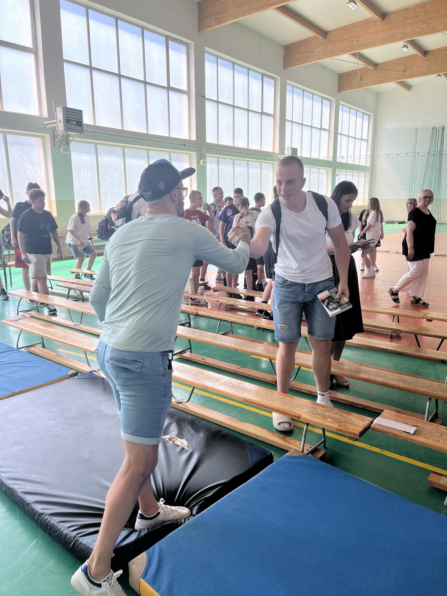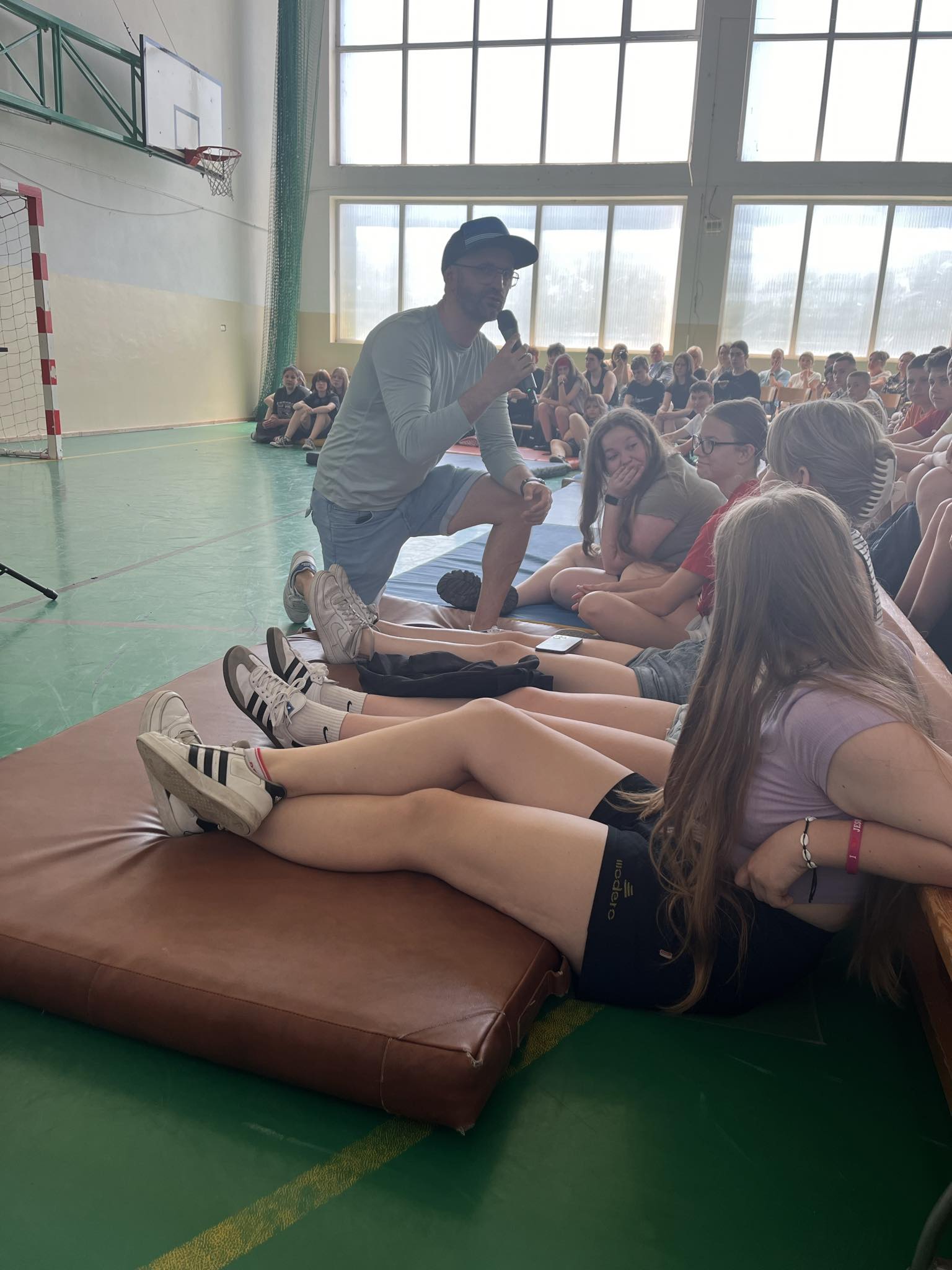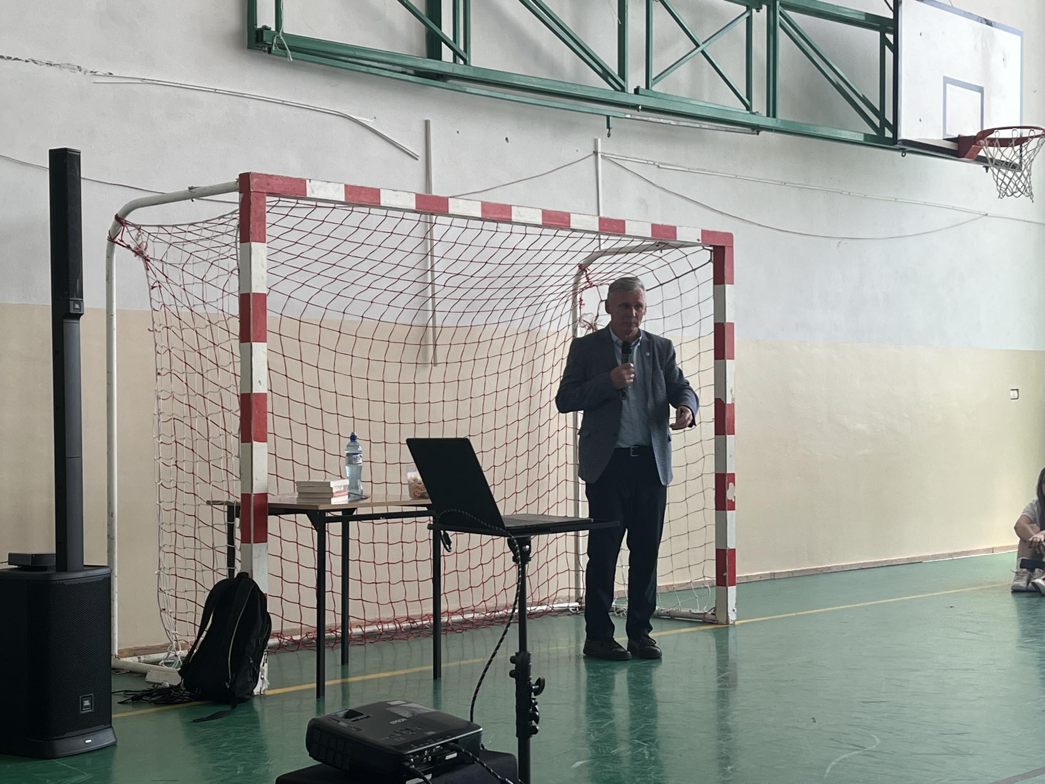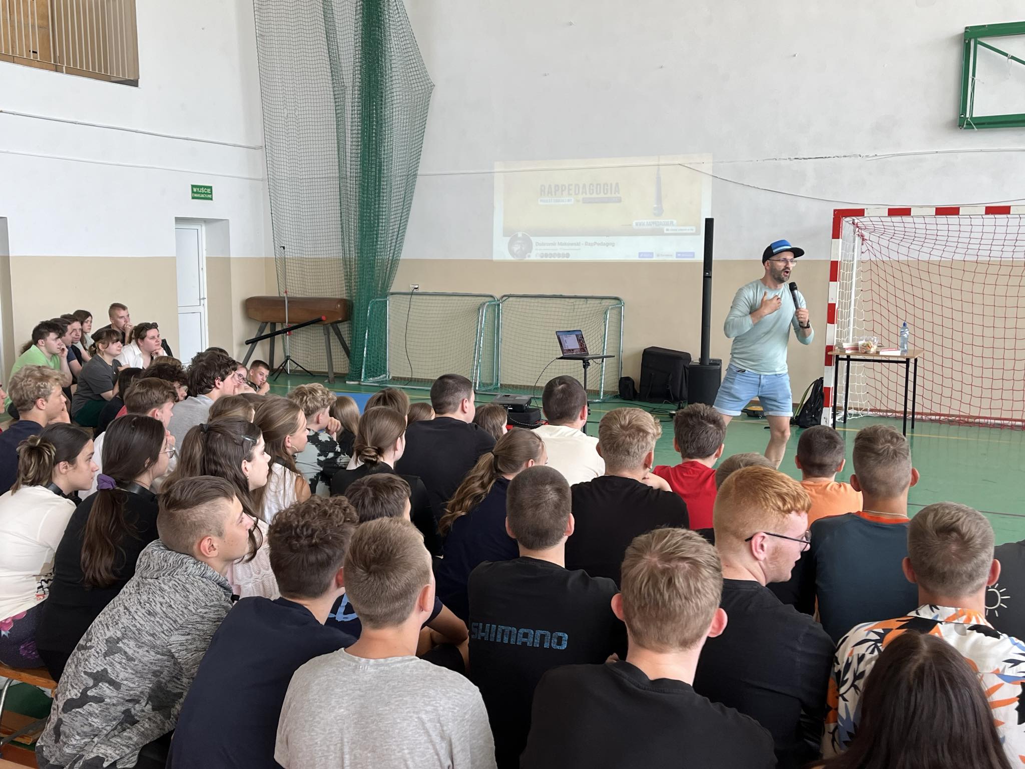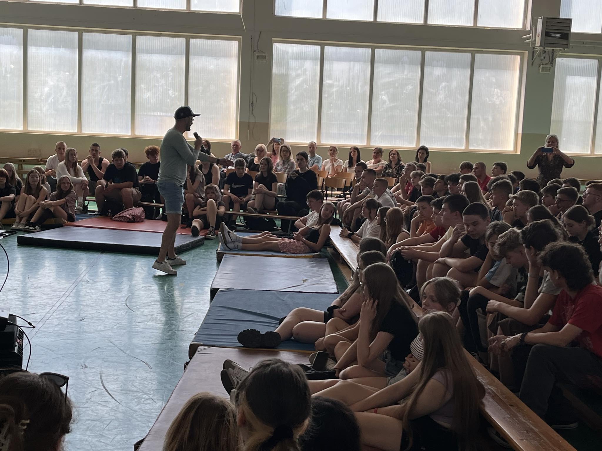 Te i inne hasła wybrzmiały dziś ( 28.05.2024 r.) w hali sportowej naszej szkoły podczas wyjątkowego spotkania w ramach zajęć profilaktycznych. Gościem specjalnym był Dobromir Makowski– pedagog i pomysłodawca projektu „Rappedagogia”. Do udziału w spotkaniu zaprosiliśmy klasy ósme z terenu naszej gminy wraz z opiekunami oraz naszych licealistów. Swoją obecnością zaszczycili nas również: Wójt Gminy Obrowo-p. Andrzej Wieczyński, Zastępca Wójta- p. Joanna Zielińska oraz p. Grażyna Jurkiewicz- kierownik Gminnej Biblioteki Publicznej w Dobrzejewicach, która również jest współorganizatorką tego spotkania.