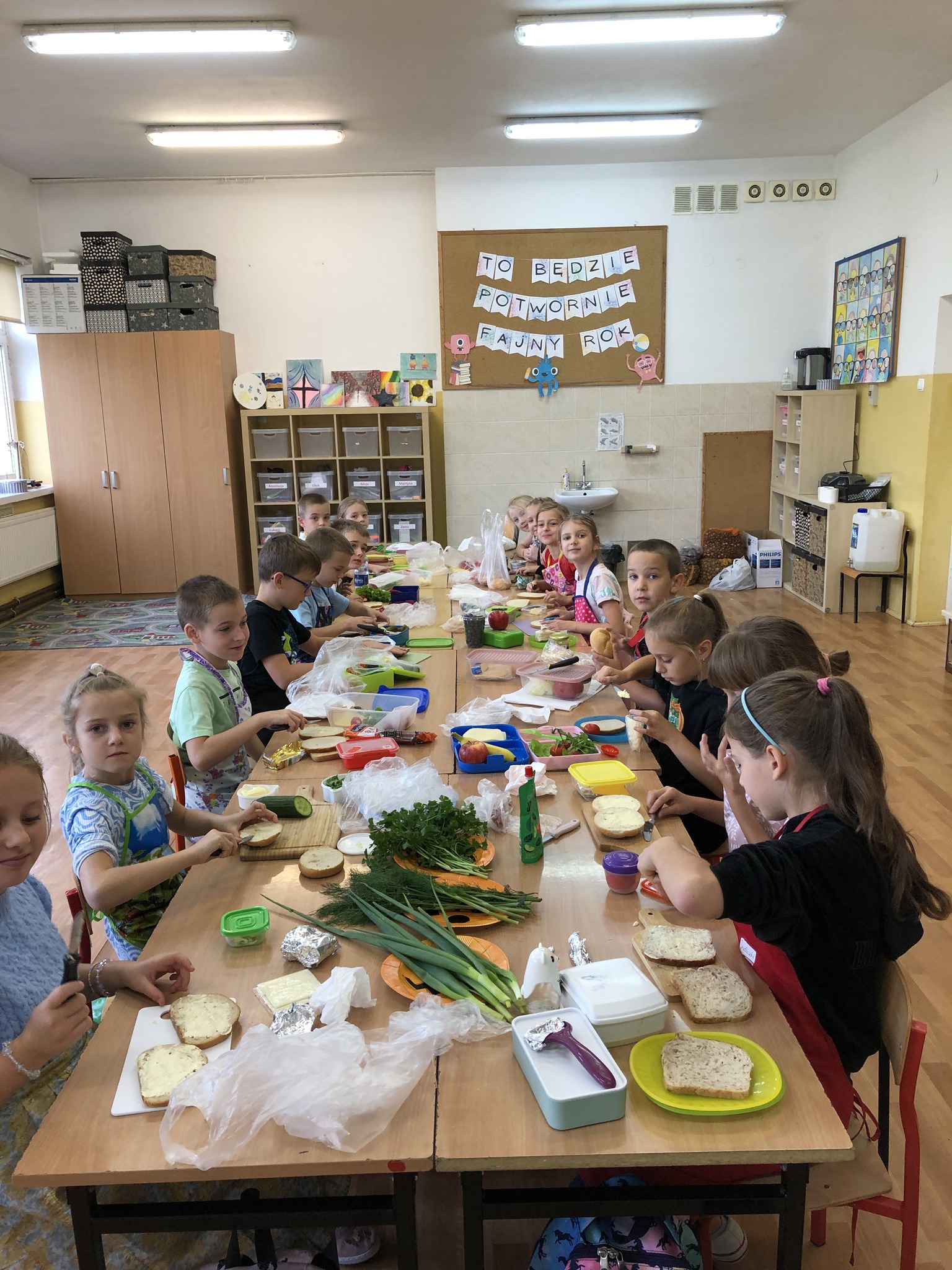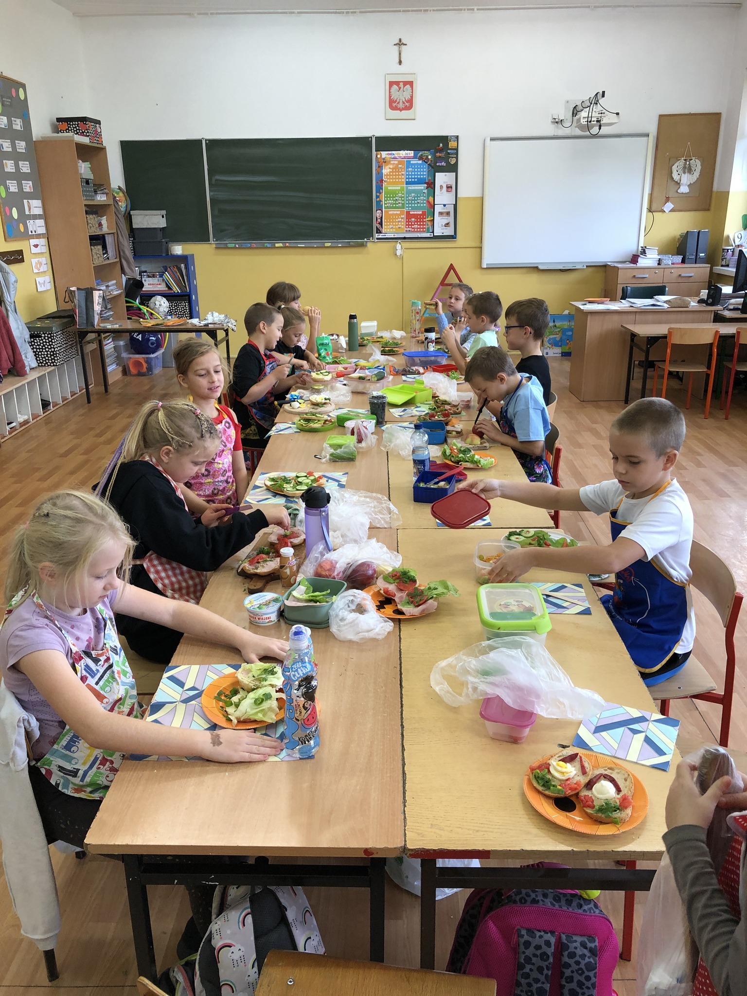 Uczniowie klasy 2 b kolejny rok uczestniczą w klasowej akcji „Zdrowe śniadania”. Każdego dnia uczniowie przynoszą zdrowe i pożywne kanapki oraz owoce i warzywa. Dzięki takiemu posiłkowi drugoklasiści mają energię na cały dzień. W tym roku szkolnym uczniowie poznali piramidę zdrowego żywienia, komponowali zdrowy jadłospis na cały dzień, a na koniec tygodnia o zdrowym odżywianiu, przygotowali smaczne, zdrowe i wesołe kanapki.